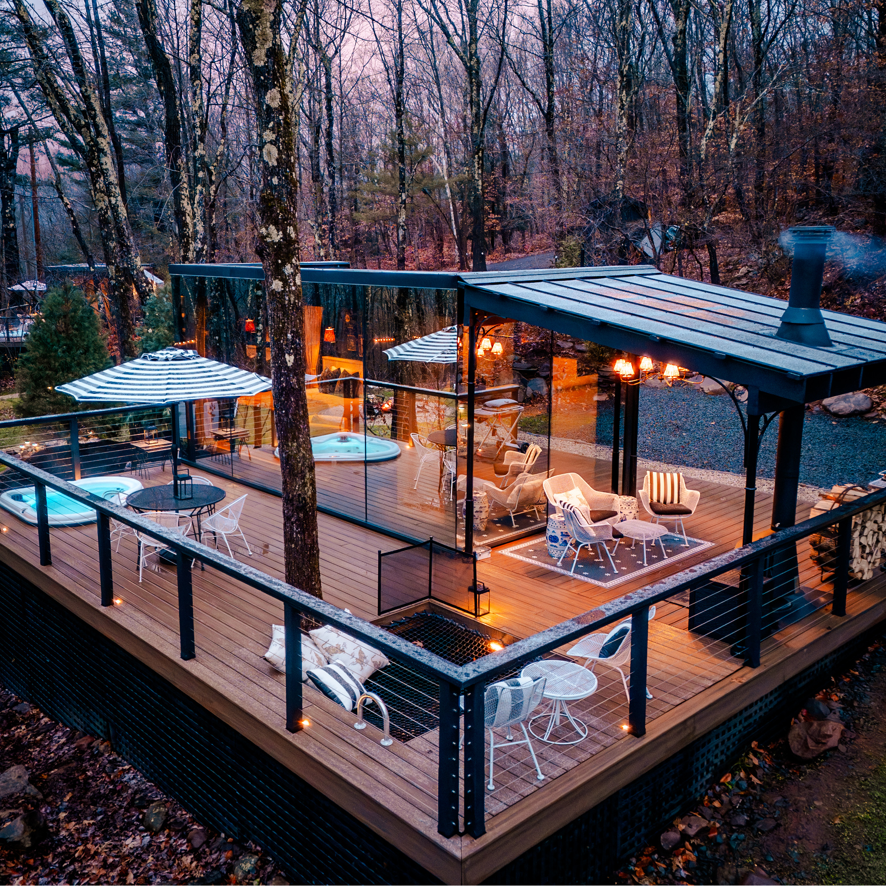 Sunset is reflecting back at you while you soak in the hot tub. The day was spent skiing at Hunter Mountain but the evening belongs to relaxing. A benefit of a mirrored cabin is the uninterrupted beauty from every angle, inside and out. Inside the Lion’s Lair the vibes are lux and cozy. Petite in size but with a huge personality! Equipped with more than meets the eye you’ll have everything you need for your stay from well stocked kitchenette, ample storage, hidden projector screen, games and books and more. Grab a book and a tea then sink into the built-in hammock or lounge in the outdoor living area in front of a roaring fire. Beyond your cozy accommodations the grounds of Camp KILLERCAT are ready to entertain you. There oodles of games, including giant chess and outdoor pingpong, a bocce ball court sits next to the communal firepit. Sprinkle in some well deserved self-care with the sauna and yoga platform. Uninterrupted beauty from every angle, inside and out.