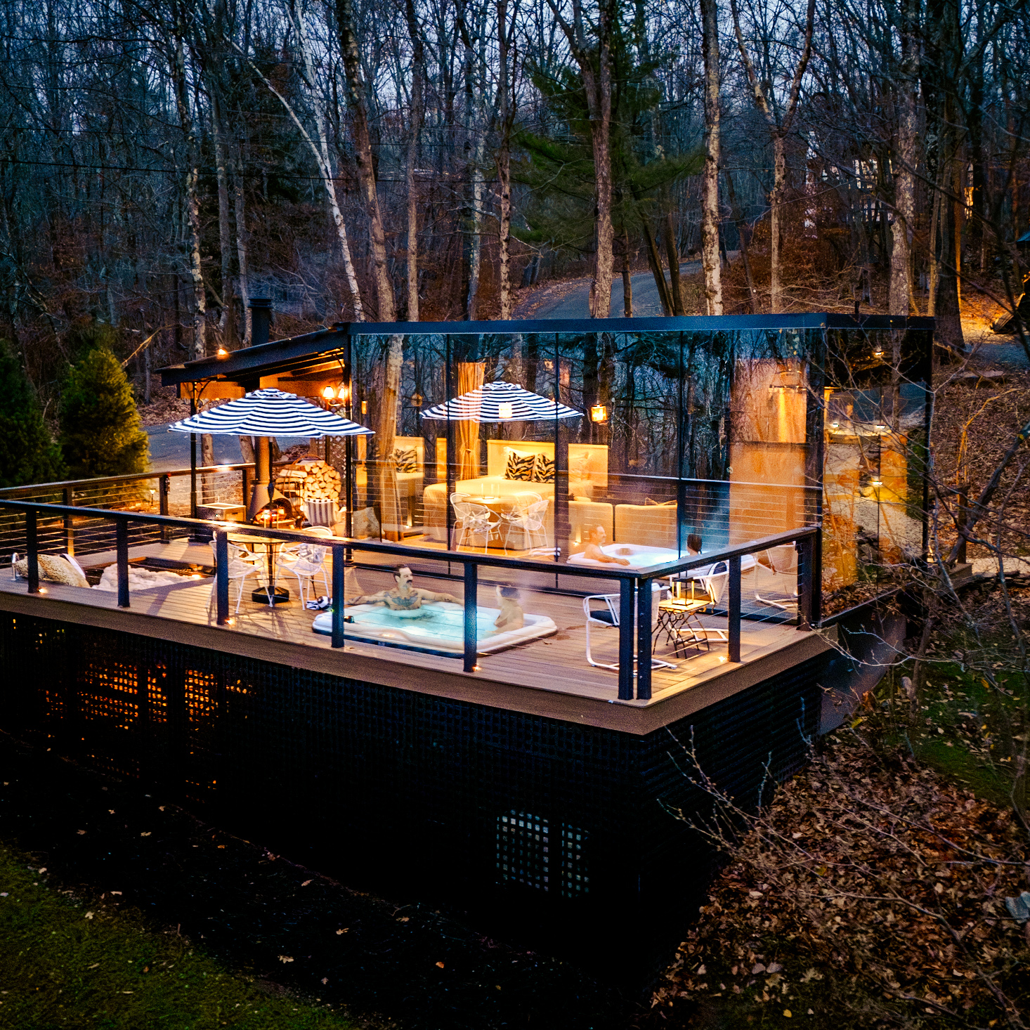 The sun is rising over Hunter Mountain, a small family of deer is grazing and you're enjoying this picturesque scene from the comfort of bed. A benefit of a mirrored cabin is the uninterrupted beauty from every angle, inside and out. Inside the Tiger’s Den the vibes are lux and cozy. Petite in size but with a huge personality! Equipped with more than meets the eye you’ll have everything you need for your stay from well stocked kitchenette, ample storage, hidden projector screen, games and books and more. The deck has a hot tub, built in hammock and an outdoor living area under a glass pergola with a midcentury modern fireplace. With the fire going and a gentle snow falling, this made for a pretty amazing morning coffee situation. Beyond your cozy accommodations the grounds of Camp KILLERCAT are ready to entertain you. There oodles of games, including giant chess and outdoor pingpong, a bocce ball court sits next to the communal firepit. Sprinkle in some well deserved self-care with the sauna and yoga platform.